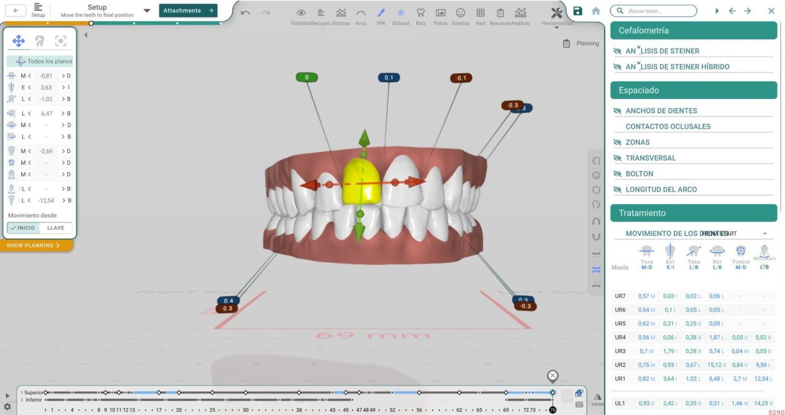 Cada diente en el gráfico es clicable; al seleccionar un diente se puede ver información detallada sobre su movimiento. El mismo cambia a color verde una vez seleccionado, y para retirar el color, podemos hacer clic directamente sobre el attachment.