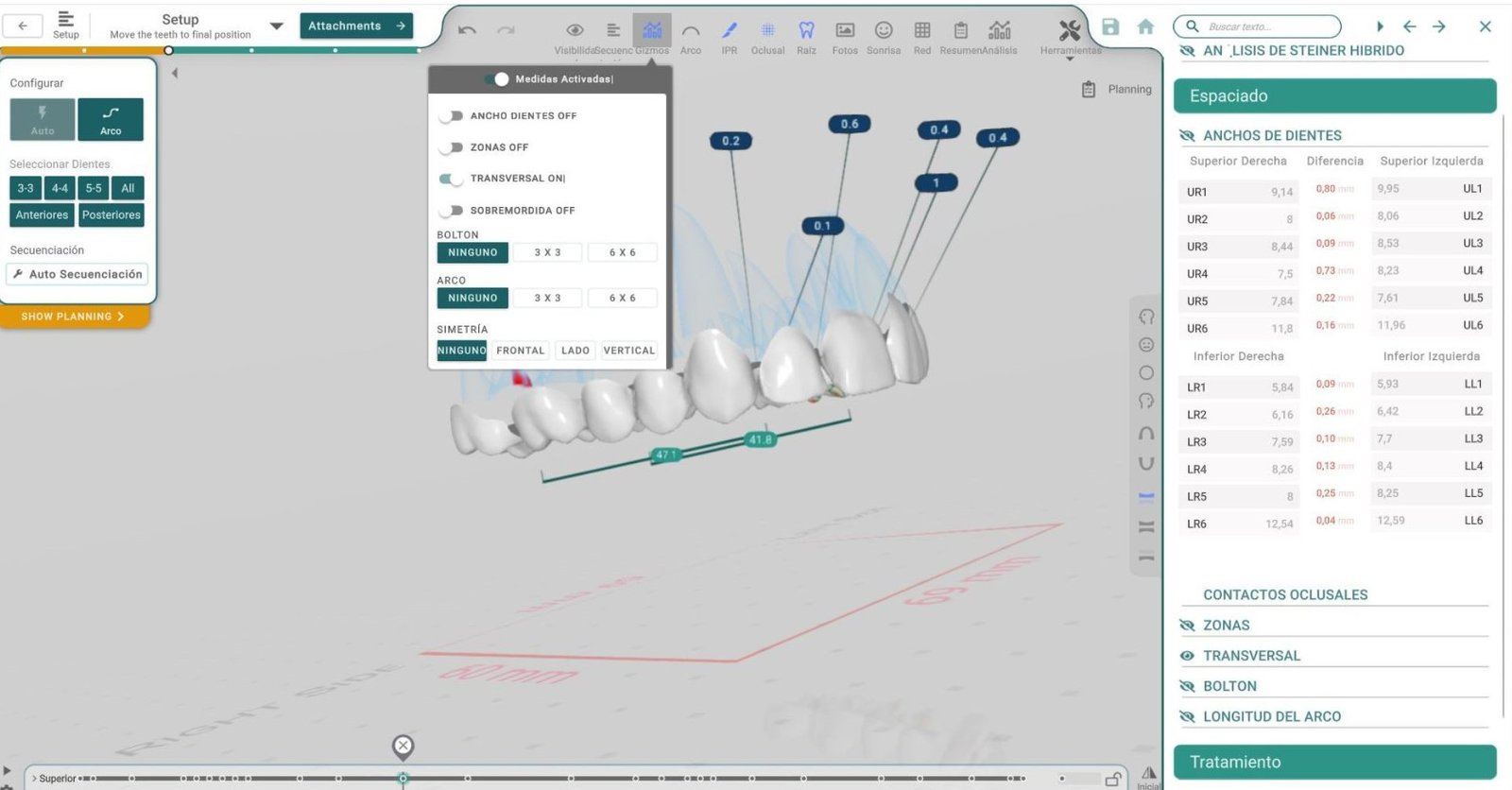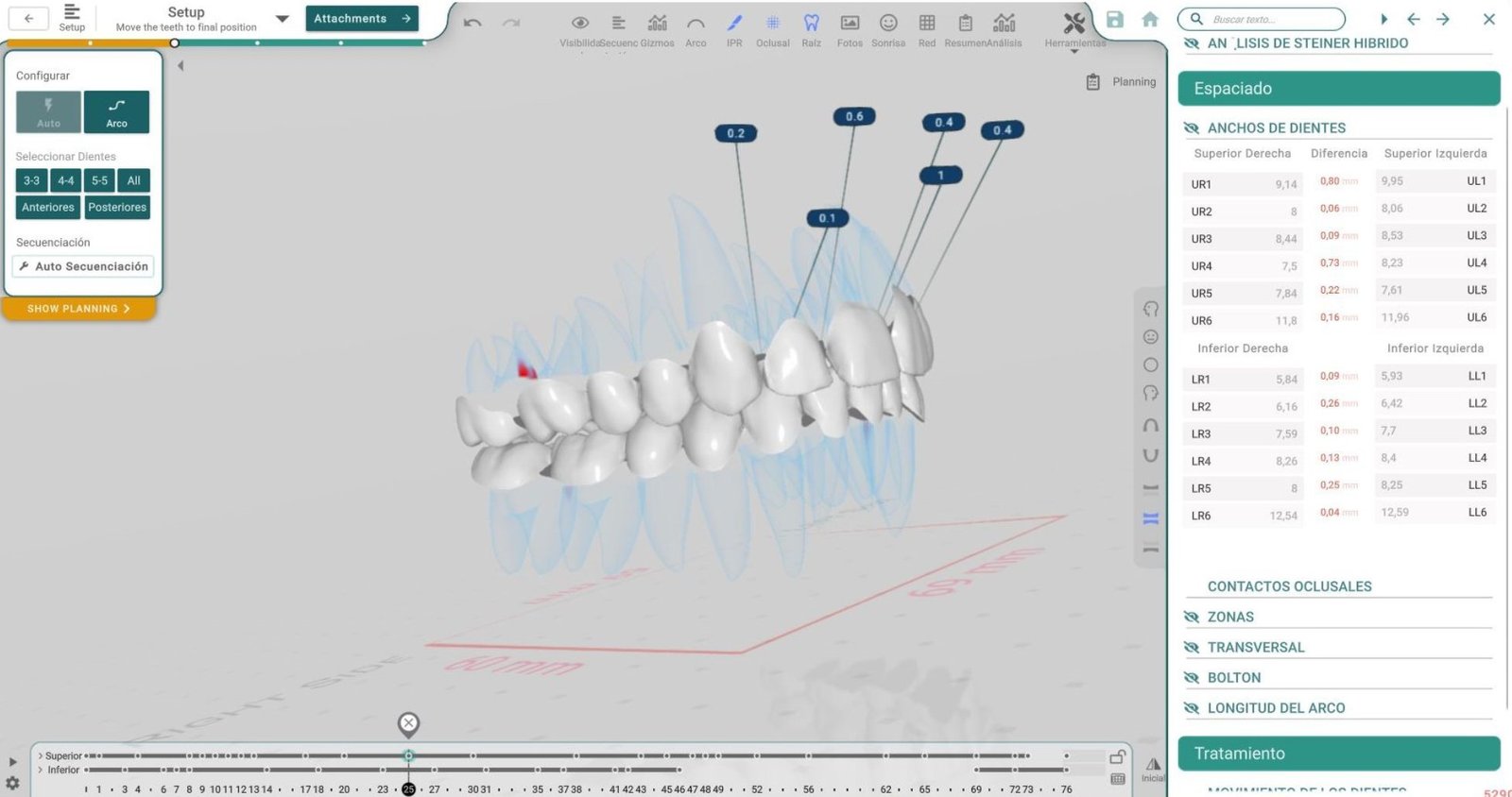 - Ajustes interactivos: Facilitan el control directo del posicionamiento de dientes y componentes en la simulación mediante arrastre o rotación.